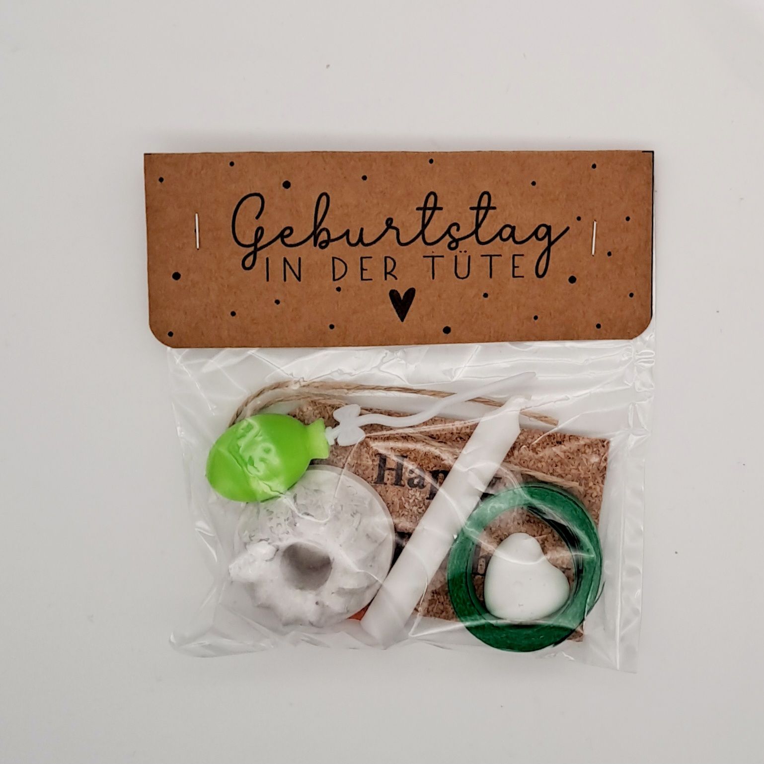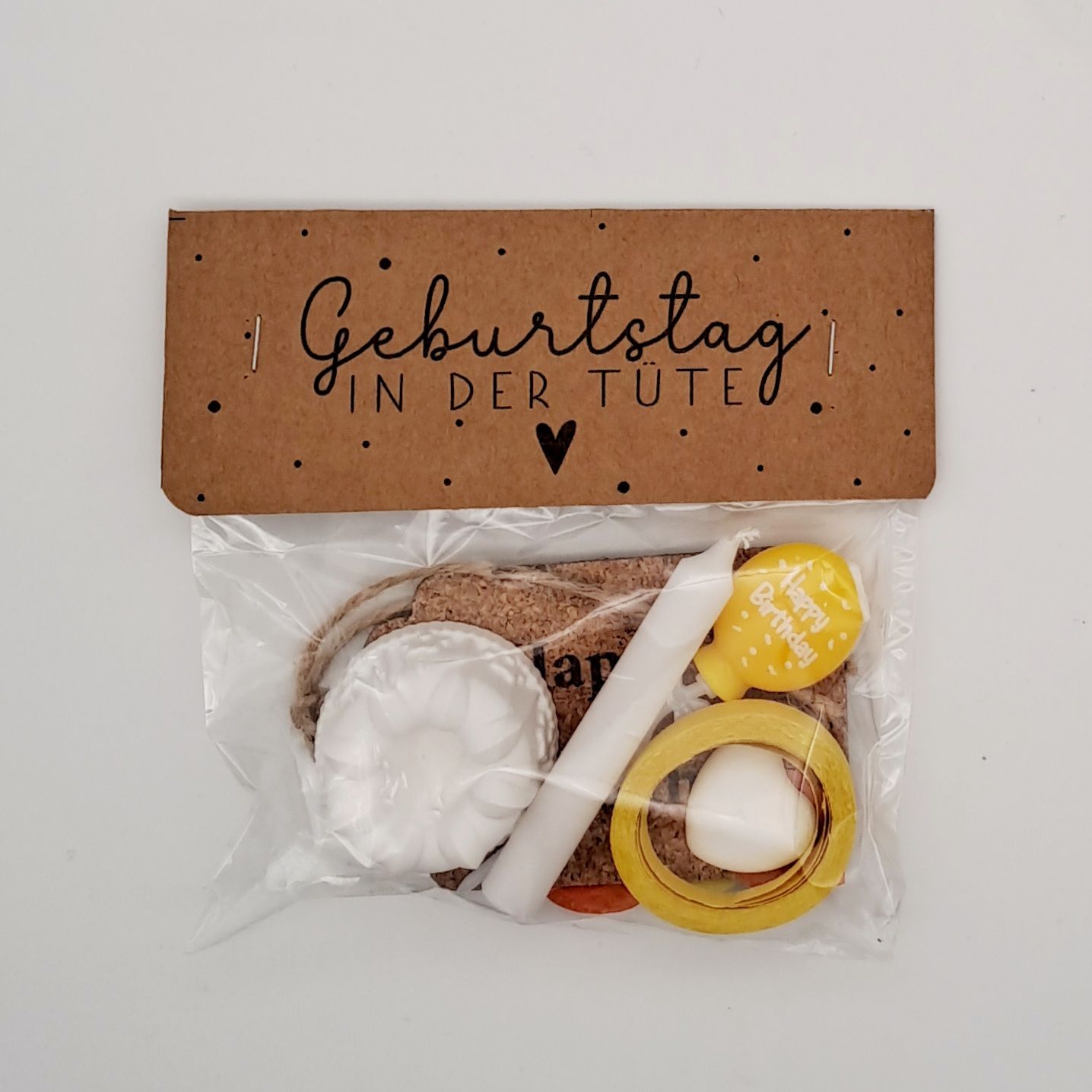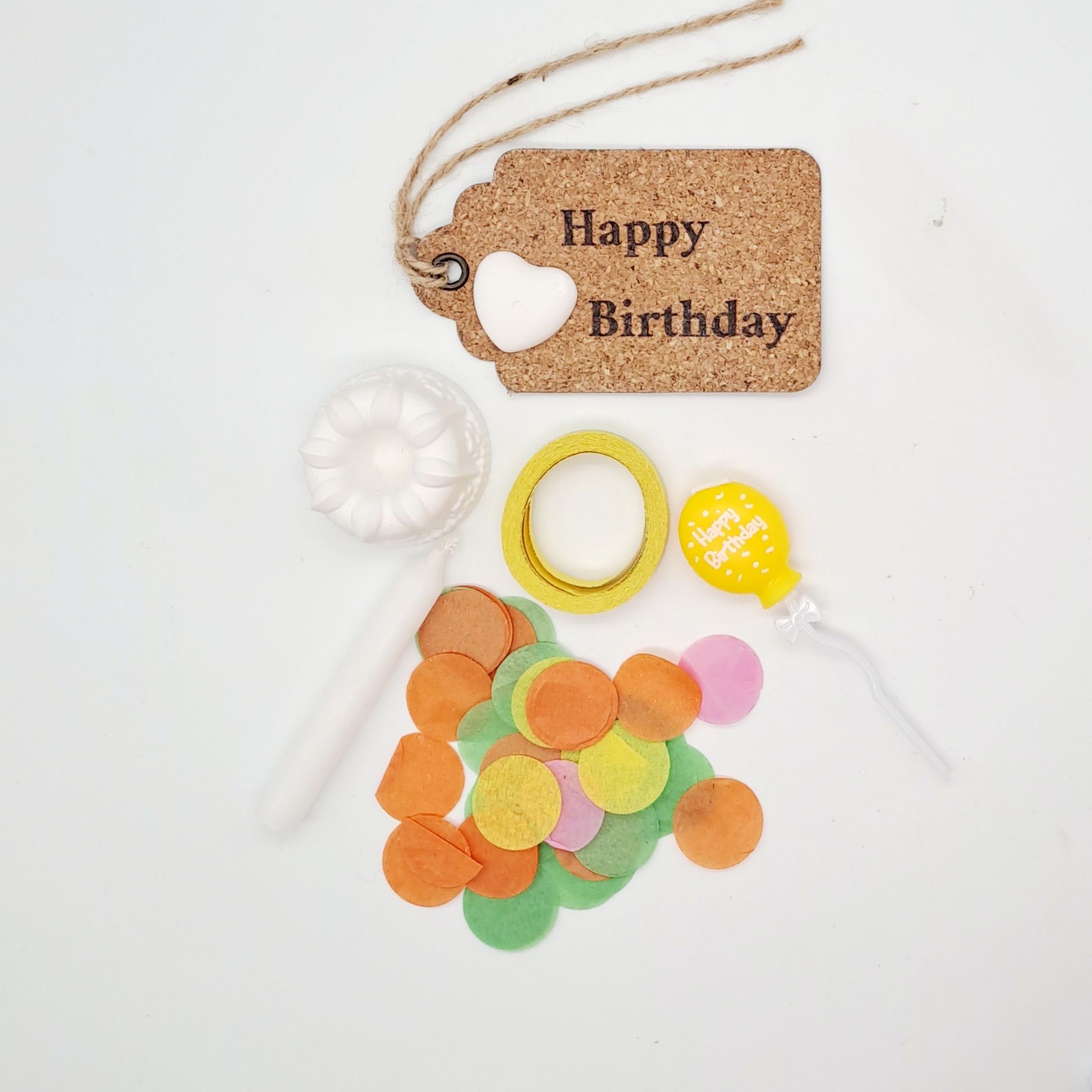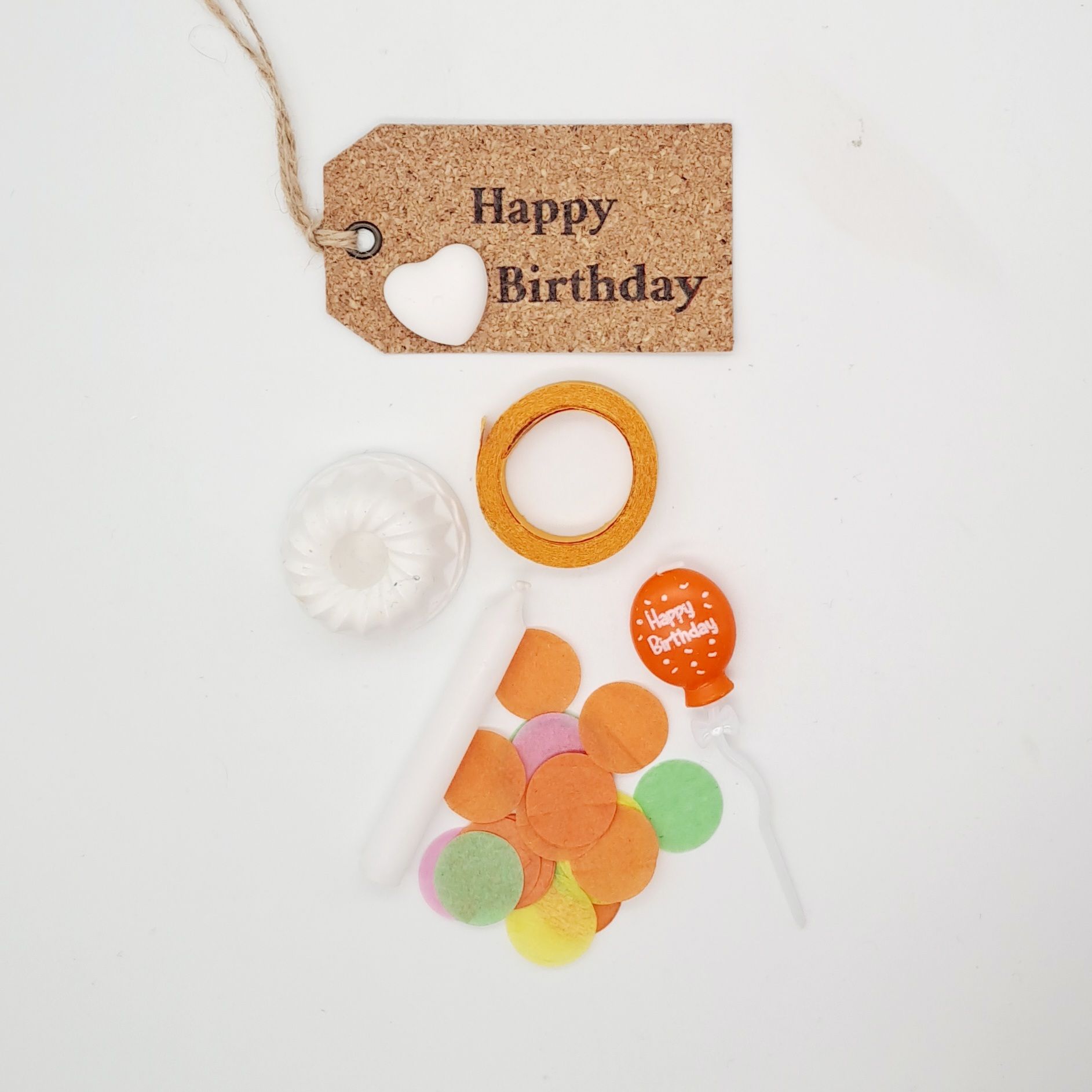 Kleiner Gugelhupf, kleine Kerze, Geburstagskerze, Luftschlange, Geschenkanhänger, etwas Konfetti und ein kleines Herz.